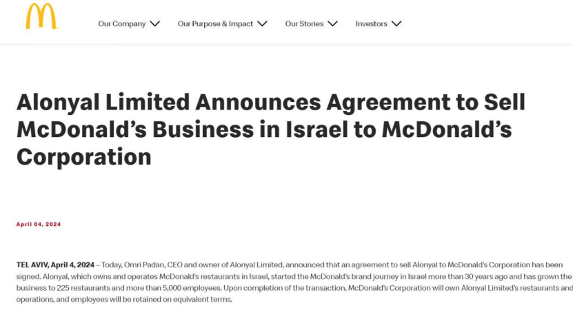 为了应对当前的危机,近日,麦当劳总部与掌握麦当劳在以色列特许经营权的以色列阿隆亚集团(Alonyal)达成协议,麦当劳总部将回购该品牌在以色列的225家餐厅。4月4日,阿隆亚集团在官网发布公告宣布了这一消息,截至目前,阿隆亚集团已经在以色列获得麦当劳的当地经营权超过30年。