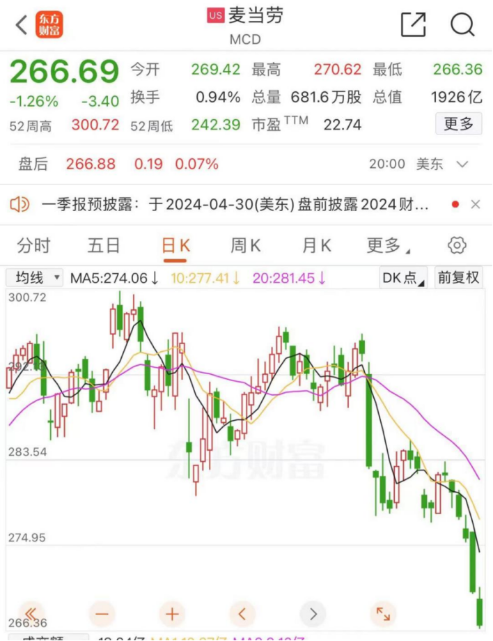 而在资本市场上,今年以来,麦当劳股价严重跑输大盘,该股累计下跌近10%,最新市值为1926亿美元。同期,道指、纳指、标普500指数分别上涨了3.22%、8.24%、9.11%。