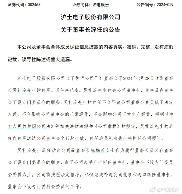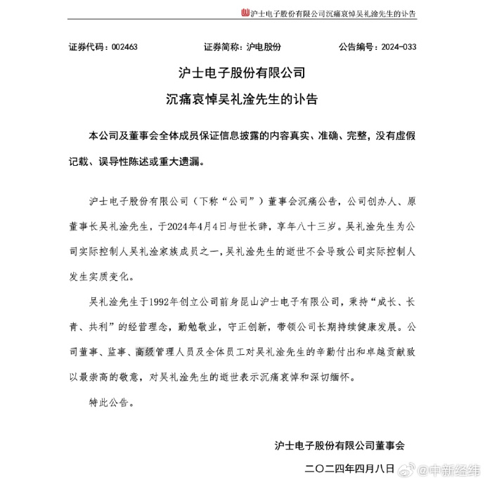 4月7日晚间,沪电股份公告称,公司创办人、原董事长吴礼淦,于2024年4月4日与世长辞,享年83岁。沪电股份表示,吴礼淦的逝世不会导致公司实际控制人发生实质变化。值得注意的是,在3月28日晚间,沪电股份才公告宣布吴礼淦辞任公司董事长一职,公告称,董事会于2024年3月28日收到董事长吴礼淦先生的辞呈。因年事已高,吴礼淦先生辞去公司董事长、董事及在董事会下设专门委员会的职务。