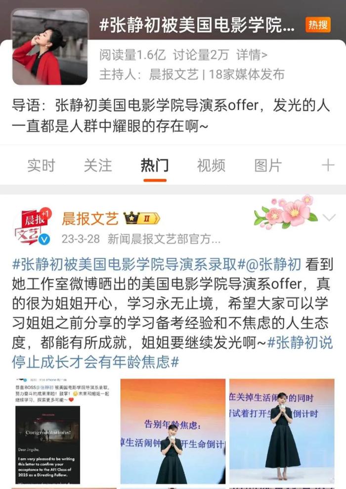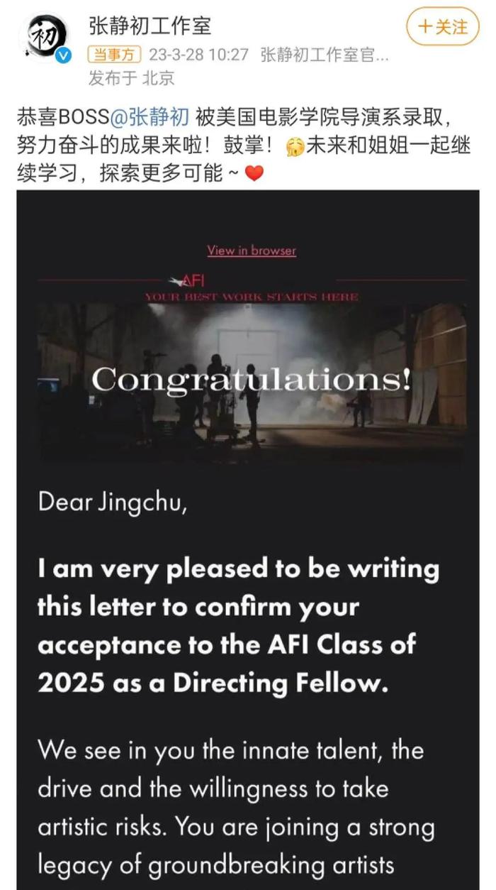 去年3月,张静初被美国电影学院导演系(简称AFI)录取,正式成为一枚美国电影留子。