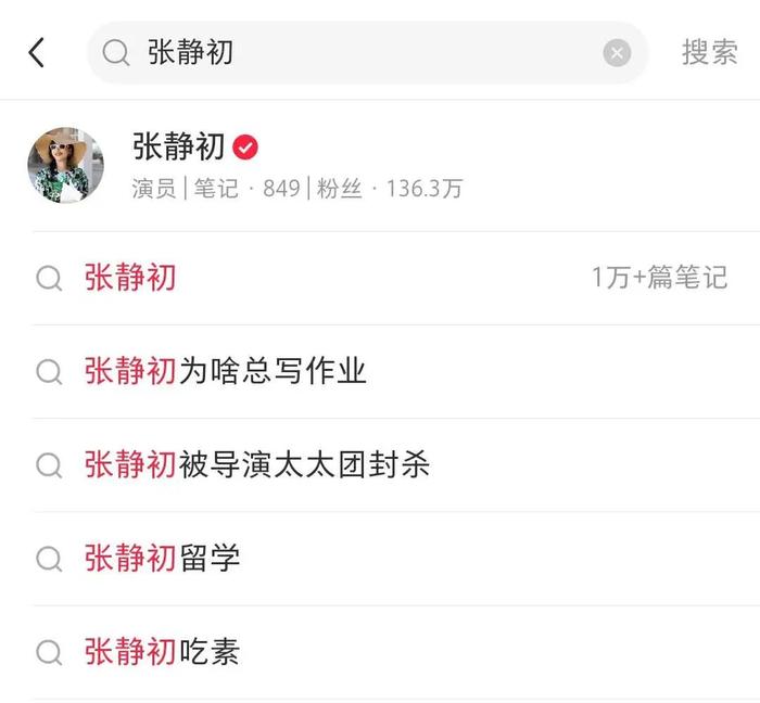 现在搜张静初,出来的联想词汇是“张静初为啥总写作业”。