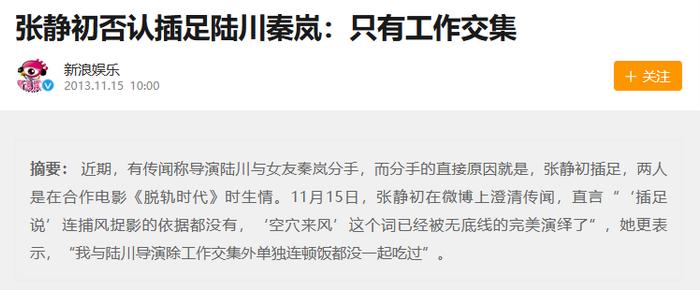 张静初同陆川合作的《脱轨时代》时,正好秦岚与陆川闹分手,两人感情破裂的锅竟然又被扣到张静初头上,说她插足当第三者,被秦岚“捉奸在床”,成为二人分手的导火索。