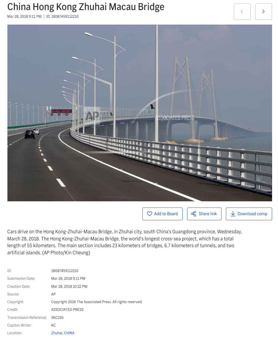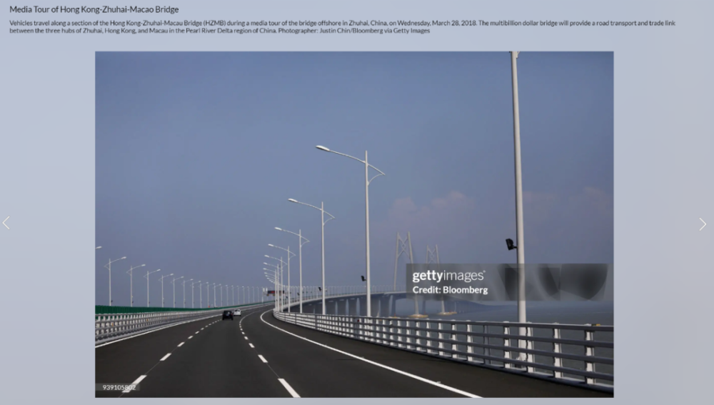 著名图库类网站Getty Images上有许多拍摄日期相同且视角相似的照片。其中一张来自彭博社的图片说明显示,2018年3月28日是港珠澳大桥的媒体参观日。