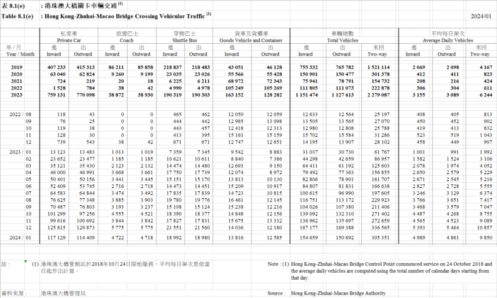 港珠澳大桥关卡交通车辆统计(截止2024年1月)。数据来源:香港特别行政区政府运输署。