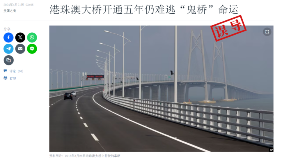 4月21日,“美国之音中文网”发布了一篇标题为《港珠澳大桥开通五年仍难逃“鬼桥”命运》的文章,被多家海外媒体转载报道,在X(推特)平台上的阅读量已近50万。文章称,中国的港珠澳大桥“在2018年开通后,使用量一直不理想”,“大桥给人的感觉仍然是使用率偏低,甚至不少媒体称之为‘鬼桥’”。
