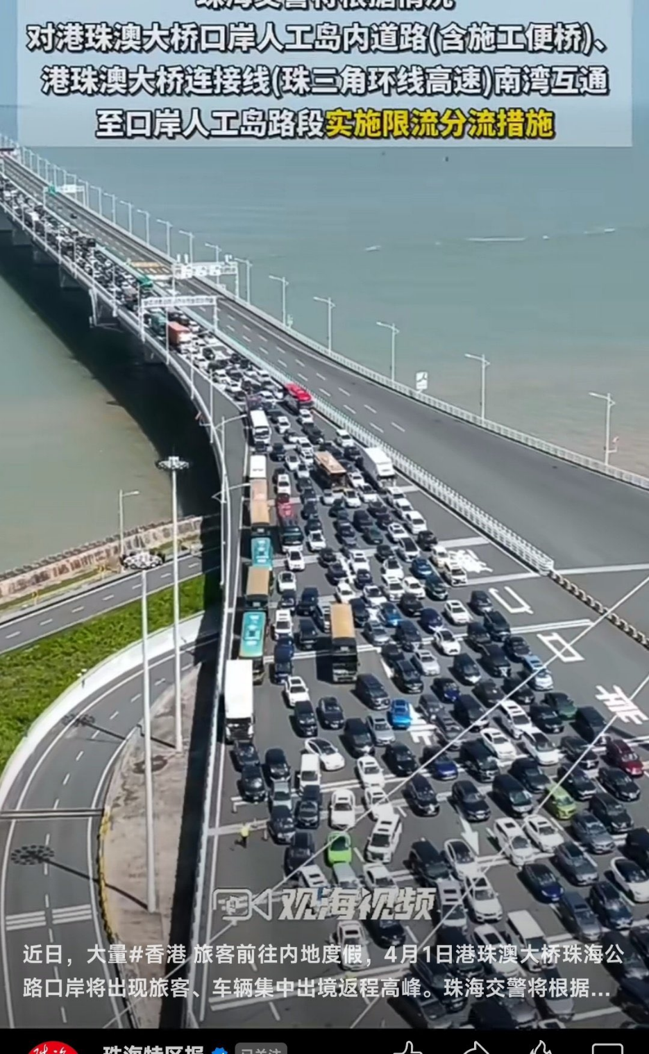 《珠海特区报》视频号在4月1日发布视频称,“近日,大量香港旅客前往内地度假,4月1日港珠澳大桥珠海公路口岸将出现旅客、车辆集中出境返程高峰。珠海交警将根据情况对部分路段进行分流。”
