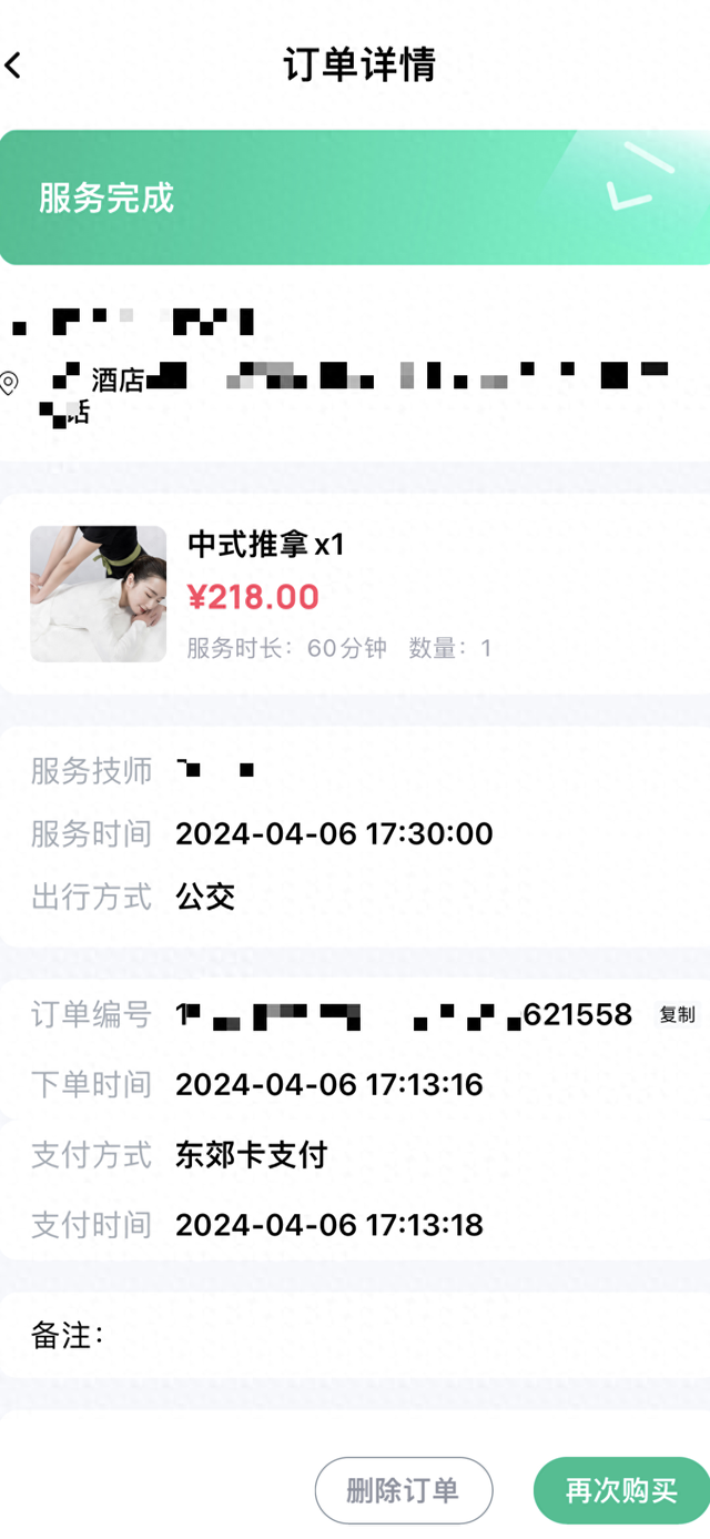 赵先生透露,4月6日下午,他因为出差工作劳累,于是使用东郊到家平台预约了一个200多元的酒店内上门按摩,服务内容是中式推拿。