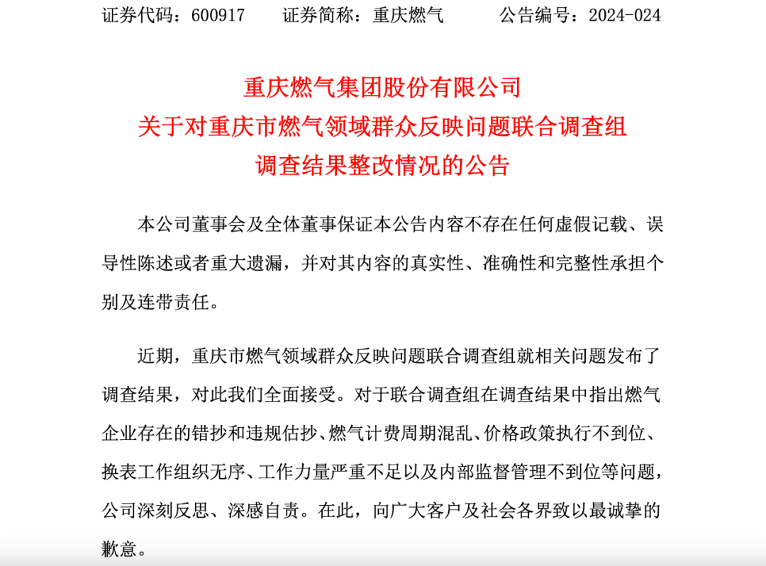 4月28日,重庆燃气集团股份有限公司(以下简称重庆燃气集团)发布《关于对重庆市燃气领域群众反映问题联合调查组调查结果整改情况的公告》。