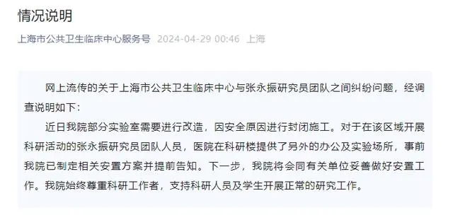 “网上流传的关于上海市公共卫生临床中心与张永振研究员团队之间纠纷问题,经调查说明,近日我院部分实验室需要进行改造,因安全原因进行封闭施工。对于在该区域开展科研活动的张永振研究员团队人员,医院在科研楼提供了另外的办公及实验场所,事前我院已制定相关安置方案并提前告知。下一步,我院将会同有关单位妥善做好安置工作。我院始终尊重科研工作者,支持科研人员及学生开展正常的研究工作。”