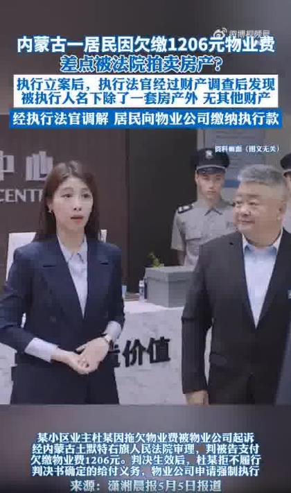 近日,内蒙古一小区业主杜某,因拖欠物业费被其小区物业公司起诉至法院,法院判决被告杜某向原告某物业公司支付欠缴的物业费1206元,但判决生效后,杜某拒不履行判决书确定的给付义务,其名下房产差点被司法拍卖。因杜某名下除了某小区的一套房产以外无其他财产,执行法官暂未对其名下房产进行处置,希望通过调解的方式化解矛盾。最终,杜某认识到错误,主动缴纳了执行款。