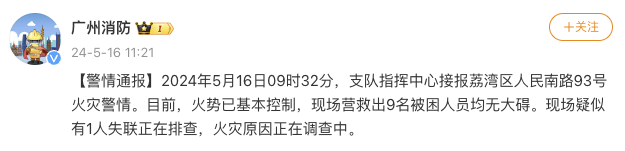据广州市消防救援支队最新通报,2024年5月16日09时32分,支队指挥中心接报荔湾区人民南路93号火灾警情。目前,火势已基本控制,现场营救出9名被困人员均无大碍。现场疑似有1人失联正在排查,火灾原因正在调查中。根据通报,人民南路93号地址为龙城服装交易中心。资料显示,龙城服装交易中心开设于2010年,是#广州十三行#服装批发市场商圈中较为出名的一个服装批发市场。