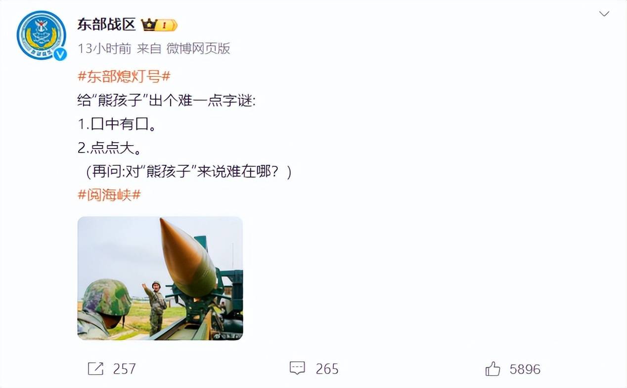 5月26日晚,东部战区发了一条“颇有深意”的字谜:“口中有口”,“点点大”。并称给“熊孩子”出个难一点字谜。那么,这字谜对“熊孩子”来说,这个看似简单实则寓意深远的谜题,究竟难在哪里呢?此举仿佛是在向“熊孩子”发出呼唤,希望他能解开谜底,早日醒悟,早日迷途知返!