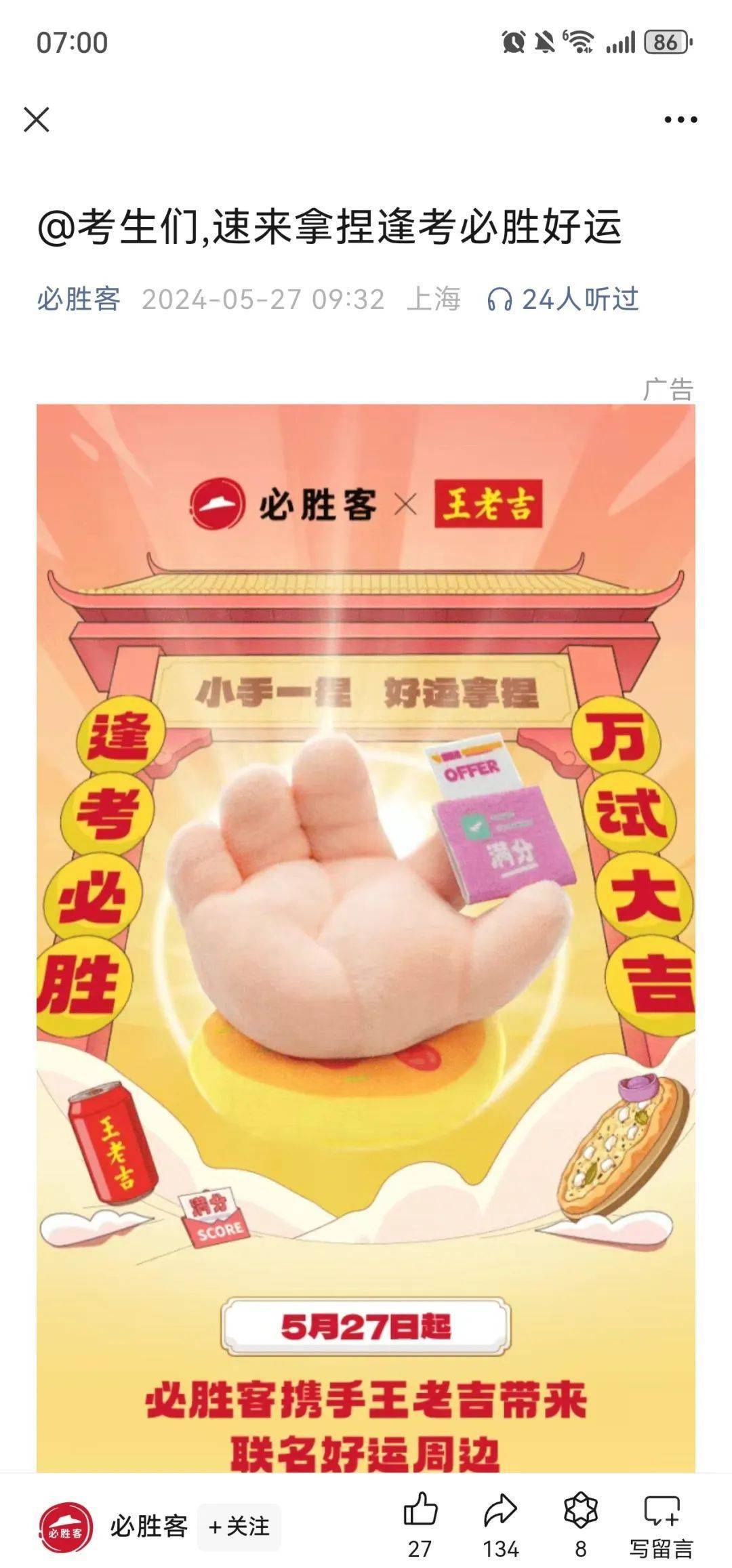 据悉,5月27日,必胜客官方微信公众号发布宣传文章称,购买某套餐可获“好运拿捏挂件”或“王老吉拿捏主题定制罐”。截至5月31日7时,必胜客官方微信公众号的该篇文章仍可查看。