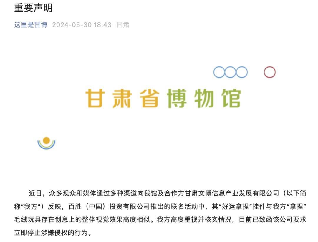 据甘肃省博物馆官方微信“这里是甘博”5月30日发布的重要声明,近日,众多观众和媒体通过多种渠道向甘肃省博物馆及合作方甘肃文博信息产业发展有限公司(以下简称“我方”)反映,百胜(中国)投资有限公司推出的联名活动中,其“好运拿捏”挂件与我方“拿捏”毛绒玩具存在创意上的整体视觉效果高度相似。我方高度重视并核实情况,目前已致函该公司要求立即停止涉嫌侵权的行为。