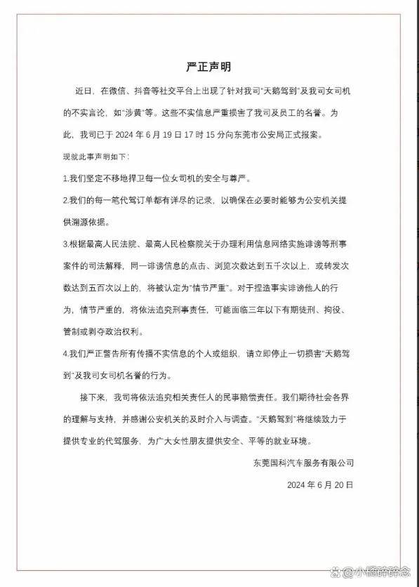“天鹅驾到”最近发出了一份严厉的警告,针对所有散布虚假信息的个人或组织,要求他们立即停止所有损害公司及其女司机名誉的行为。这件事已经闹得沸沸扬扬,可以看出“天鹅驾到”确实是真的火大了。这次事件不仅仅是公司声誉的问题,更触及到女性职工权益的重大议题。毕竟,谁不希望在一个既安全又受尊重的环境中工作呢?