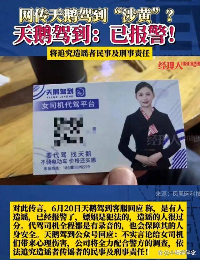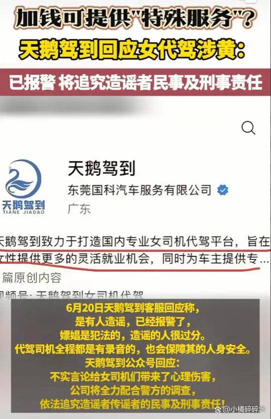 故事是这样的,有人在网上放出了一张聊天截图,声称使用了“天鹅驾到”的代驾服务还能“额外加服务”,享受所谓的“特殊服务”。这截图一发布,立马引起了网友的极大关注,讨论的热度直线上升。面对这种情况,“天鹅驾到”赶紧出面澄清,他们表示:“我们是正规的代驾服务,关于这个造谣的事情,我们已经向警方报案了。