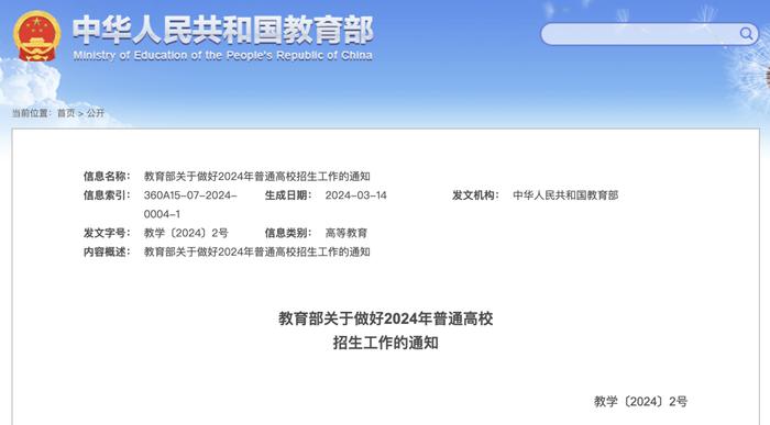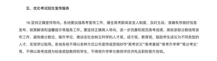 此前,教育部曾发布《关于做好2024年普通高校招生工作的通知》。其中明确各地各校不得以各种方式公布宣传或变相炒作“高考状元”“高考喜报”“高考升学率”“高分考生”等。