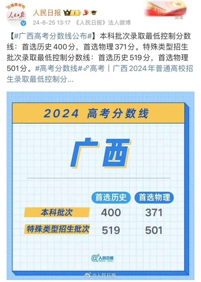 6月25日,广西全区划定并公布2024年普通高校招生录取最低控制分数线。