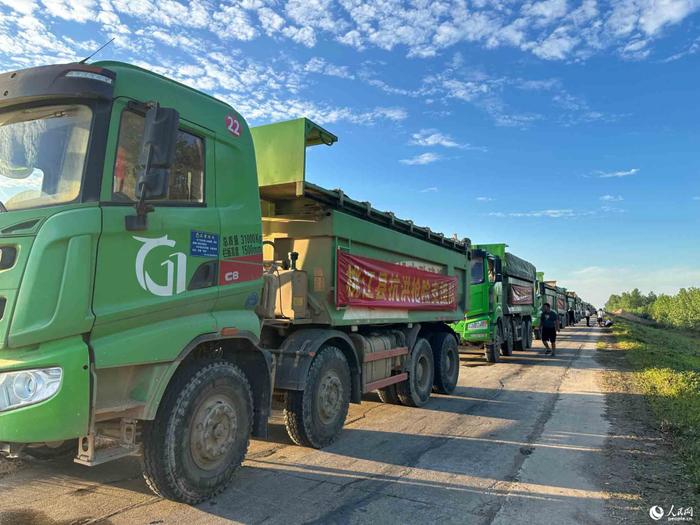 他告诉记者,接到通知后,自己立即开车前往指定集合地点,并按车载最大承载量装运好石块。晚21时,在当地交警大队和交通运输部门的牵引下车队集中前往华容县,于6日凌晨1时抵达溃堤现场。