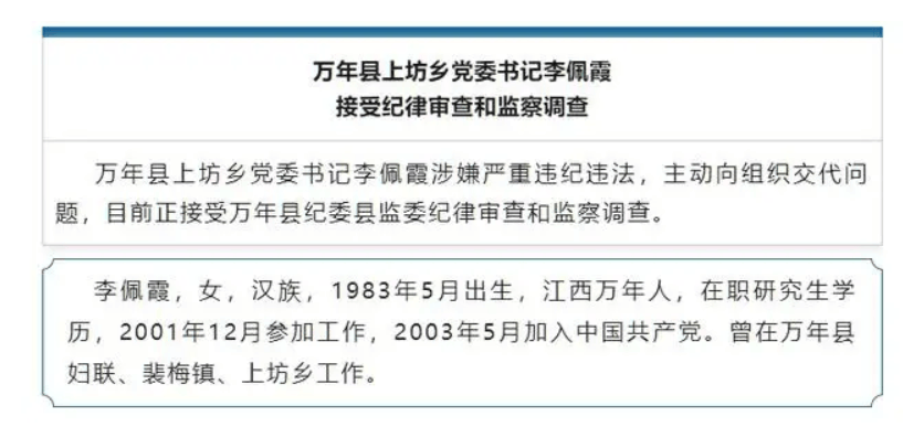 2023 年 6 月,江西省纪委监委信访室收到群众实名检举李佩霞的信访件,反映其在任万年县上坊乡党委书记期间存在虚列经费、违规做假账、违规插手工程等问题。省纪委监委依规将信访件转至万年县纪委监委处理。2023 年 7 月,万年县纪委监委对这些问题展开初核。
