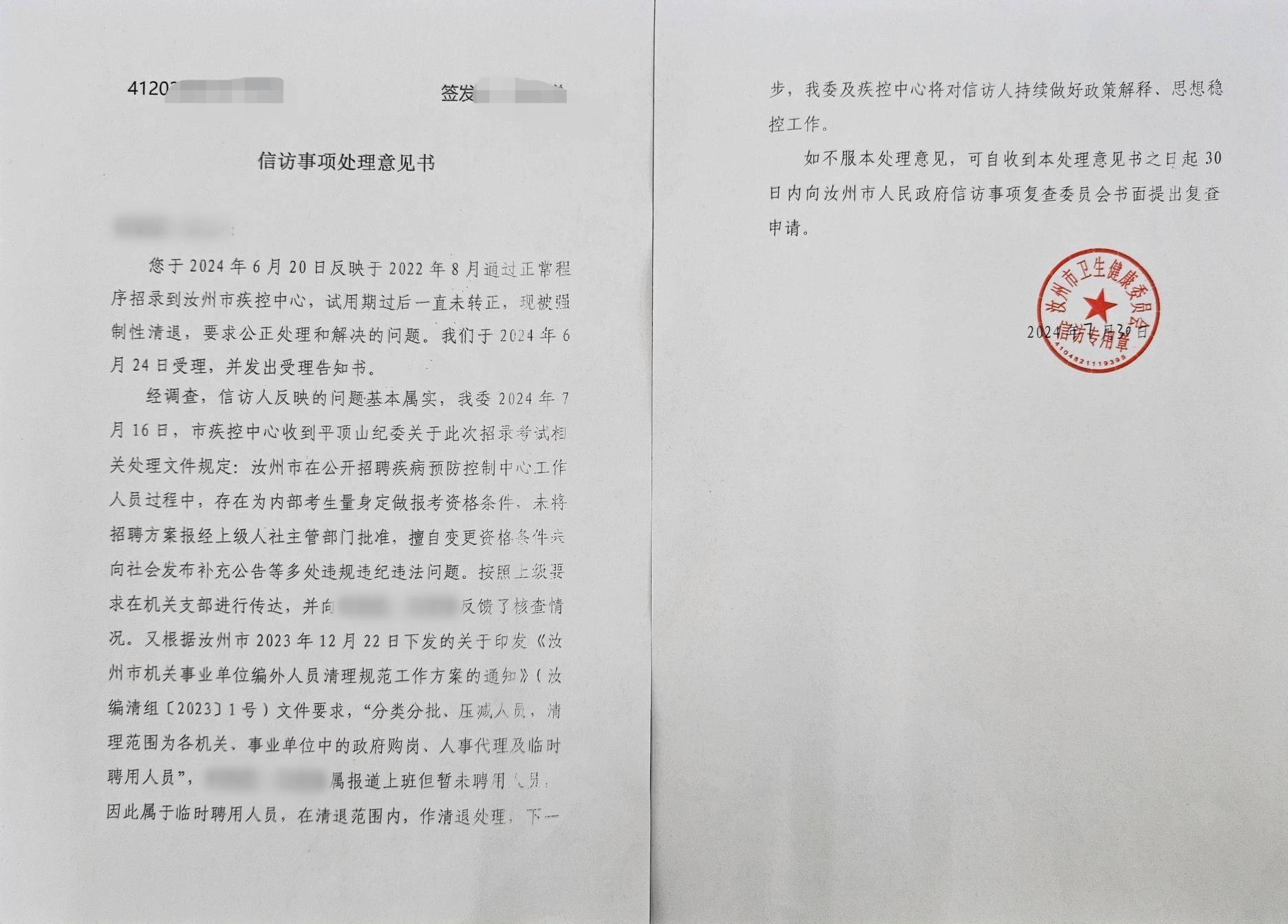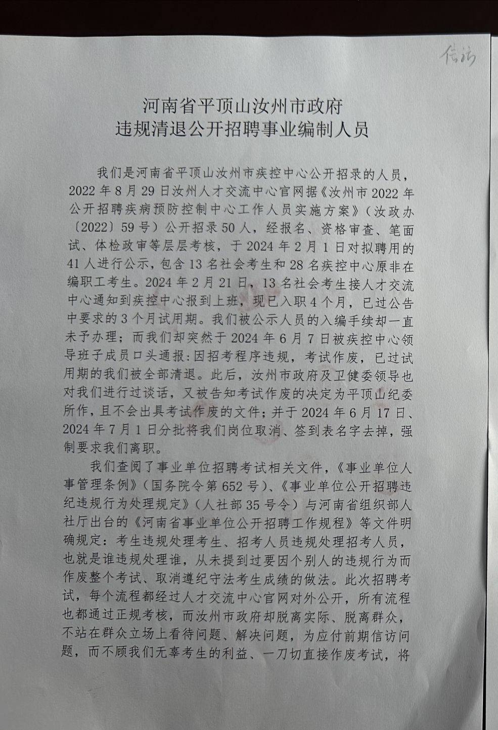 2024年7月16日,市疾控中心收到平顶山纪委关于此次招录考试相关处理文件规定:汝州市在公开招聘疾病预防控制中心工作人员过程中,存在为内部考生量身定做报考资格条件,未将招聘方案报经上级人社主管部门批准,擅自变更资格条件表未向社会发布补充公告等多处违规违纪违法问题。