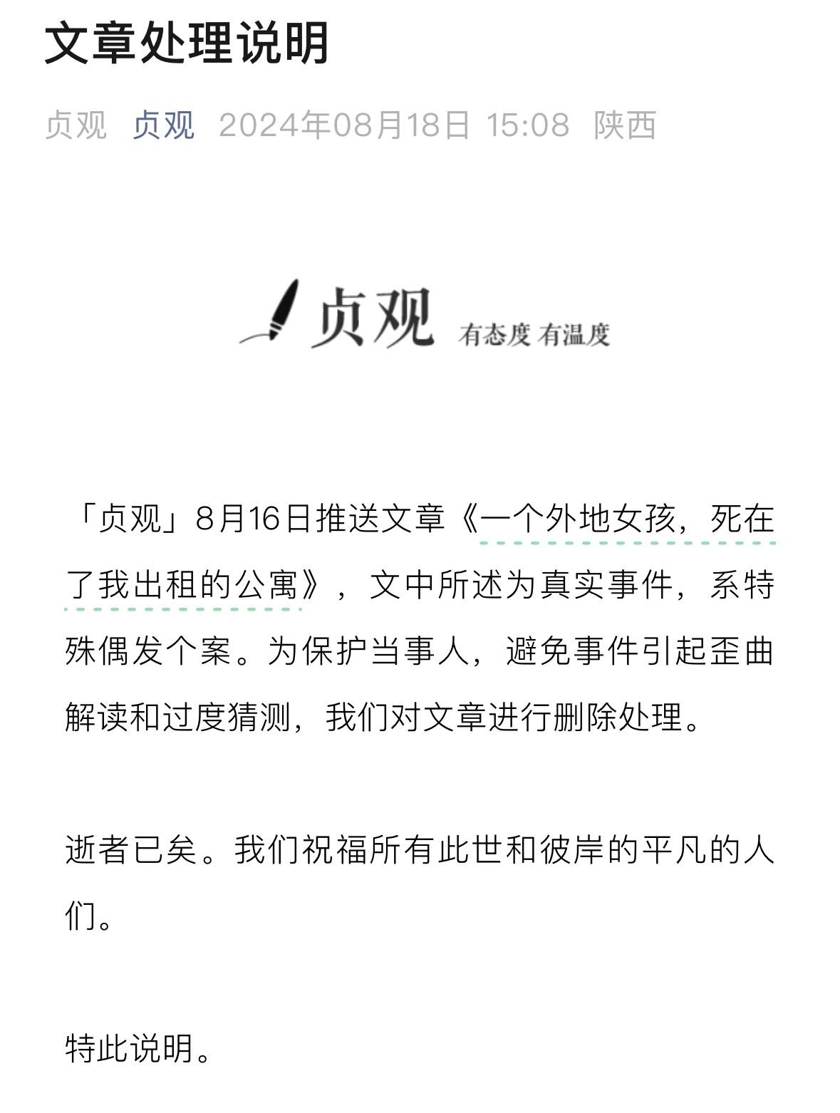 18日下午,该公众号发布了《文章处理说明》:「贞观」8月16日推送文章《一个外地女孩,死在了我出租的公寓》,文中所述为真实事件,系特殊偶发个案。
