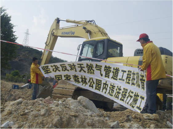 2、西气东输工程,国家环保部于2008年8月28日作出的《关于西气东输二线工程(东段)环境影响报告书的批复》(〔环审2008〕318号)里面明确指出西气东输二线工程(东段)广州—深圳支干线,最初规划工程隧道路线是从樟木头镇的石马河穿过,即东莞市樟木头镇观音山施工段的的输气管道是沿观音山公园外侧通过公园,不在公园的范围内进行任何穿越施工,但是,在实际施工过程中,施工方却擅自将管道进行了改道,以大开挖的方式将石油管道改道直接穿越了观音山公园的山体。在未获得相关部门审批手续的情况下强行施工,砍伐森林,剖开山体面积达上万平方米,这对观音山国家森林公园的生态环境造成极大破坏。因此观音山公园对该严重违反了国家森林保护法的施工方案提出明确提出反对,要求施工方重新论证,尊重观音山保护森林的诉求,保护生态环境,但最后却迎来了骇人听闻“2.15武力施工”事件。(详情可搜索“东莞观音山2.15武力施工事件”)西气东输管道,在施工过程中临时改道穿越观音山的行为,存在规划上的违法和侵权,事后才办理规划手续仍属于程序违法,且因政策措施不协调不配套不完善给公园管理方带来许多困扰。