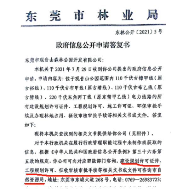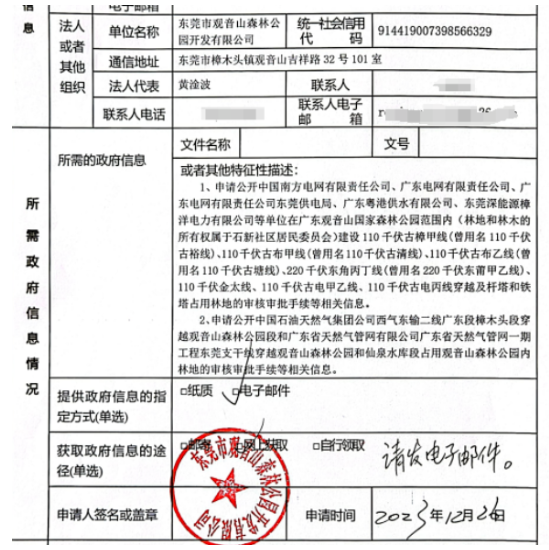 2023年12月27日,东莞市观音山森林公园开发有限公司向东莞市自然资源局寄送了政府信息公开申请,申请公开以下政府信息:1、中国南方电网有限责任公司、广东电网有限责任公司、广东电网有限责任公司东莞供电局、广东粤港供水有限公司、东莞深能源樟洋电力有限公司等单位在广东观音山国家森林公园范围内(林地和林木的所有权属于石新社区居民委员会)建设110千伏古樟甲线(曾用名110千伏古裕线)、110千伏古布甲线(曾用名110千伏古清线)、110千伏古布乙线(曾用名110千伏古塘线)、220千伏东角丙丁线(曾用名220千伏东莆甲乙线)、110千伏金太线、110千伏古电甲乙线、110千伏古电丙线穿越及杆塔和铁塔占用林地的审核审批手续等相关信息。2、中国石油天然气集团公司西气东输二线广东段樟木头段穿越观音山森林公园段和广东省天然气管网有限公司广东省天然气管网一期工程东莞支干线穿越观音山森林公园和仙泉水库段占用观音山森林公园内林地的审核审批手续。