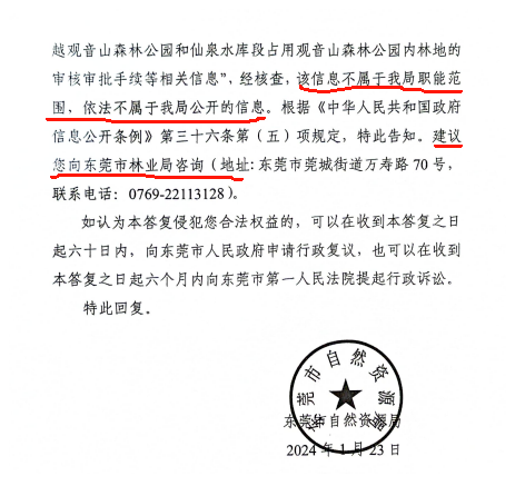 2024年1月23日,东莞观音山开发公司收到了东莞市自然资源局2024年1月23日作出的东自然资公开(2024)109号《关于政府信息公开申请的答复》。在该《关于政府信息公开申请的答复》中,东莞市自然资源局称:申请人申请公开的信息,“经核查,该信息不属于我局职能范围,依法不属于我局公开的信息,建议您向东莞市林业局咨询。”
