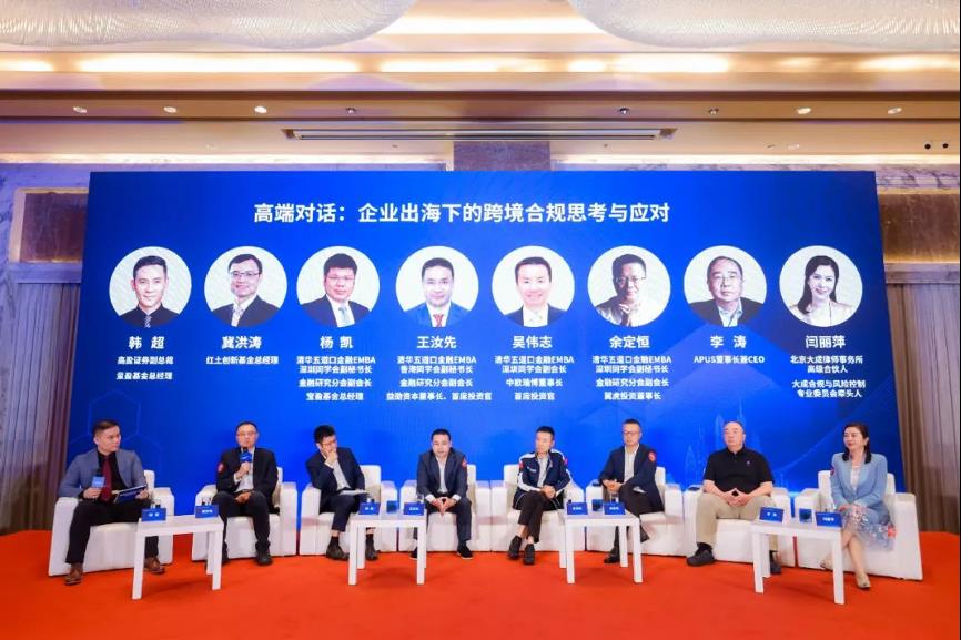 在高端对话环节,红土创新基金管理有限公司总经理冀洪涛与清华五道口金融EMBA深圳同学会副秘书长、金融研究分会副会长,宝盈基金总经理杨凯,清华五道口金融EMBA香港同学会副秘书长、金融研究分会副会长,益劭资本董事长、首席投资官王汝先,清华五道口金融EMBA深圳同学会副会长,中欧瑞博董事长、首席投资官吴伟志,清华五道口金融EMBA深圳同学会副秘书长、金融研究分会副会长,翼虎投资董事长余定恒,APUS董事长兼CEO李涛, 北京大成律师事务所高级合伙人、大成合规与风险控制专业委员会牵头人闫丽萍围绕“企业出海下的跨境合规思考与应”话题展开交流分享。高端对话由高盈证券副总裁,量盈基金总经理韩超主持。