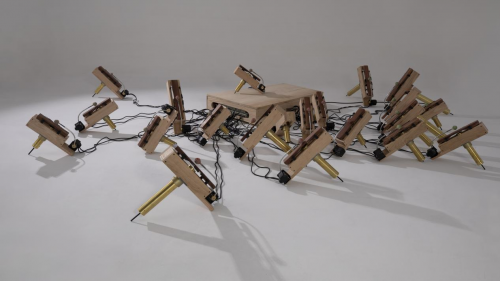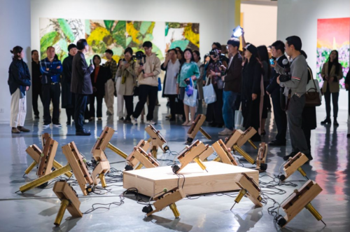 《昨日听曲》装置 “演奏” 的三首曲目分别是 iPhone 的默认铃声《开场》与《马林巴》,以及微信通话默认的来电铃声。相对较为当下的几曲手机铃声,作品题目中的“昨日”一为时间概念,指观者在早于接收到作品信息前便曾听到过这些铃响;二指作品所试图推翻的对事物固有印象的“昨日”意义,即乐器不再演奏乐曲,所听节奏也不再是音乐。在具有趣味性的演奏形式展示外,这件作品也令人生发出新的思考:这是否意味着符号化事物在无形间的全球性蔓延,以及移动媒体对人们生活的入侵?