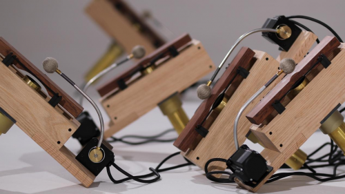 据时子媛介绍:“我试图在听觉感官上调动出人们具体的经验和记忆。在营造视听差异的创作构想下,也将音乐与乐器引入到此次创作讨论的范畴。因为观者并不会站在欣赏音乐的角度来接收这几首乐曲,所以,当装置奏响时,作品的界限也随之变得模糊,此时构成装置组建并达成发声效果的器物便不再是它们原先的乐器意义了。”