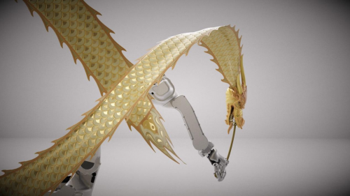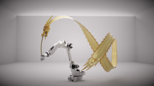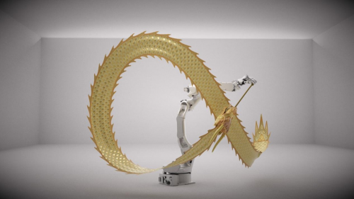 “我设想了一个空白的虚拟空间,一个银白色的机械臂屹立其中。在设计选型时,我选择了最为常见的小型工业机械臂,并在其手臂上迭代了精细动作机械手。这个机械臂代表着智能科技,与象征传统文化的中国金龙共舞,寓意着智能科技与东方文明的融合发展。在这个数字短片中,观众可以感受与龙共舞时的奇妙体验。当神龙被智能力量激活,在宇宙星球之间自由舞动出无穷大的符号,以浪漫主义基调的东方龙之舞为人类祈福。”