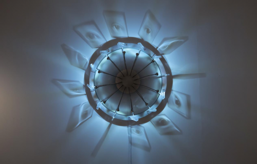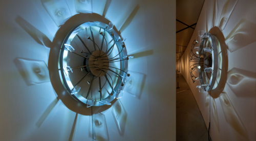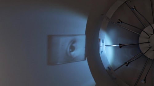 艺术家李博先后从西安美术学院和中央美术学院完成了本科阶段的综合材料绘画学习和硕士研究生阶段的科技艺术学习,现生活在北京。此次展出的《目之飞星》,作品在现场的视觉呈现效果颇为惊艳:装置造型里加⼊了时钟元素,12盏射灯与透镜寓意时光。当12盏射灯依次亮起,每块透镜也同频⾃转,在墙上投影出了眼睛的图案。完成⼀个周期后12盏射灯再次同时点亮,整体造型宛如瞳孔,呼应了“智慧之眼”的主题。