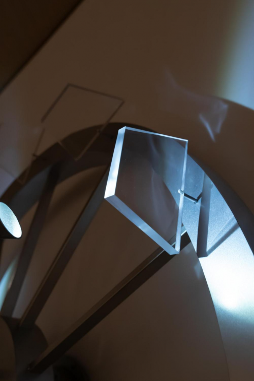 李博为透光镜的技术史以及它本身所具备的隐秘特质深深着迷,但在艺术转化的创作过程中由于工艺及工匠合作意愿不高等问题屡屡碰壁。“幸运的是在机缘巧合下我找到了中科大数院的科研团队,我们用几个月时间实验出了比较理想的呈现效果。”李博表示,尽管选择了一条从技术入手的创作路径,但身为艺术家并不想被技术所绑架。她认为技术应当服务于灵性和诗意,因此在创作主题的选择上更倾向于从自身的亲密关系出发,关照心灵。“旋转的光影让我想起父亲临终前意味深长的凝视,那些难以紧握却又刻在我心灵深处的目光,它们就像这些水晶般的透镜,以一种难以察觉的状态隐秘在时间中,又在某个时刻,在一束光线的激发下悠然显现。”