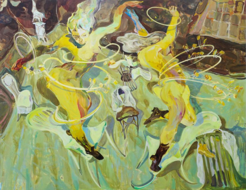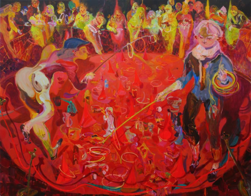 王恒介绍,她的艺术创作往往来源于日常生活、记忆印象、网络图像和文本阅读。艺术家提到,“绘画是生活的第二层皮,它向我们展示了似曾相似的面孔、人物、物品、思绪和经验。我特别欣赏细腻的观察和独特的内在感受,它是潜藏在现实之下的一股暗流。我用玩呼啦圈来比喻现代人不停忙碌的状态,随着他们摇摆的身姿,呼啦圈上的锁也随着晃动,就像戴着镣铐跳舞的人,锁是枷锁,却也可以再次转化为动能;在红色的‘套圈’游戏中,幽灵般的人物似乎有很多想追求的东西,欲望在人群中涌动,燥热不安,当时看到这个场景就突然想到了一首明代散曲《十不足》,于是就有了这幅画。”