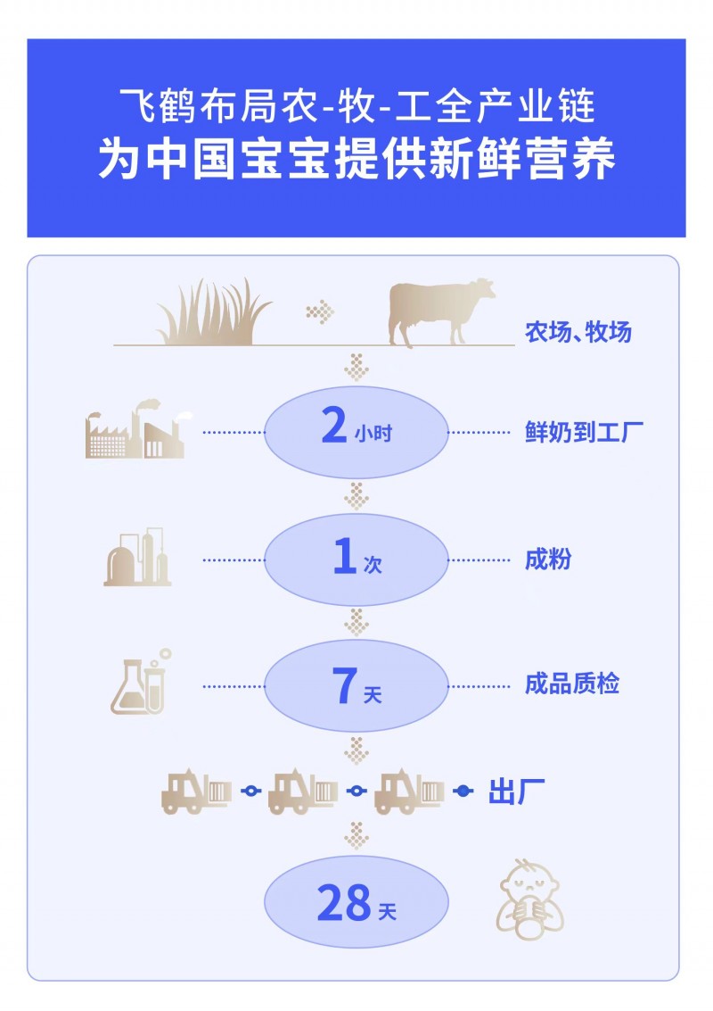 依托全产业链优势,飞鹤打造了“2小时生态圈”,将智能工厂建在自有牧场周边,通过全自动化设备采集鲜奶,将鲜奶在十分钟内降低至4℃,每一滴新鲜生牛乳从挤奶到加工成粉全程不超过2小时。同时,飞鹤联合第三方创新模式,实现产品从牧场到餐桌“28天新鲜直达”,最大化保留了鲜奶关键活性营养,给宝宝极致新鲜,更充分的营养。