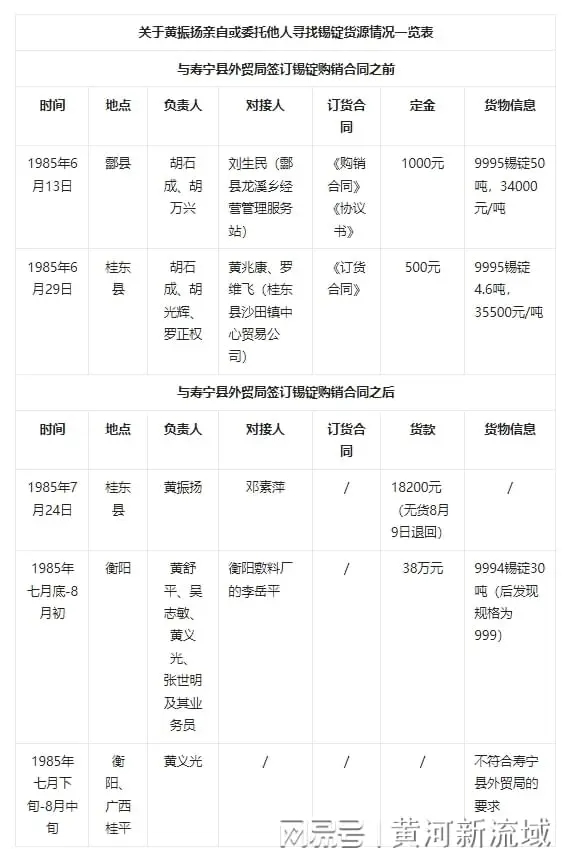 (2)黄振扬找的第二批货源是1985年6月底,胡石成通过胡光辉、罗正权找到了桂东县沙田镇中心贸易公司的黄兆康、罗维飞,就购销锡锭的事宜达成了协议