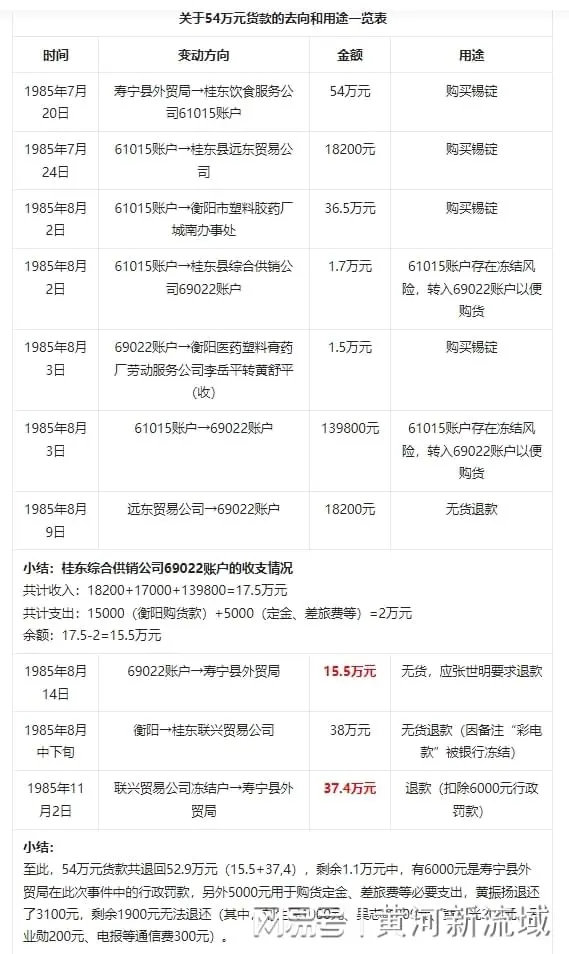 通过上述对54万元货款的去向和用途进行梳理,我们可以发现,黄振扬并未如原裁判认定的那样将货款转入自己的私人账户后挥霍一空,每一笔都是用于为寿宁县外贸局寻找锡锭货源。张世明在1985年10月7日的自书材料中提到:“在转款时我和胡讲在确实有货时才可以动用货款,如无货不能动用”。可见,上述货款的动用完全符合张世明对该笔款项用途的要求。