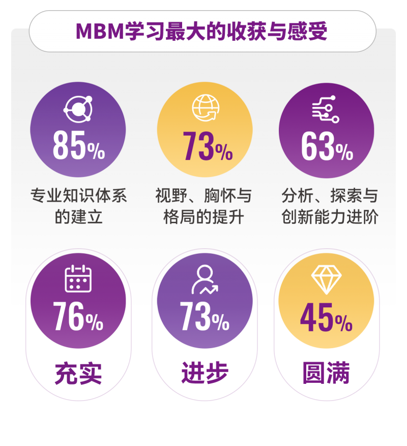 传承香港中文大学深厚的学术和教育管理积淀,MBM项目以严谨治学的风格、资深的教授团队、强大的业界导师资源、专业的教学管理体系,为学生提供一流、前沿的商管课程以及多元化、通识性的学习体验。两年的严格学习与磨砺,MBM毕业生在专业知识、创新思维、战略决策、宏观视野、领导力和格局方面均得到全面提升。