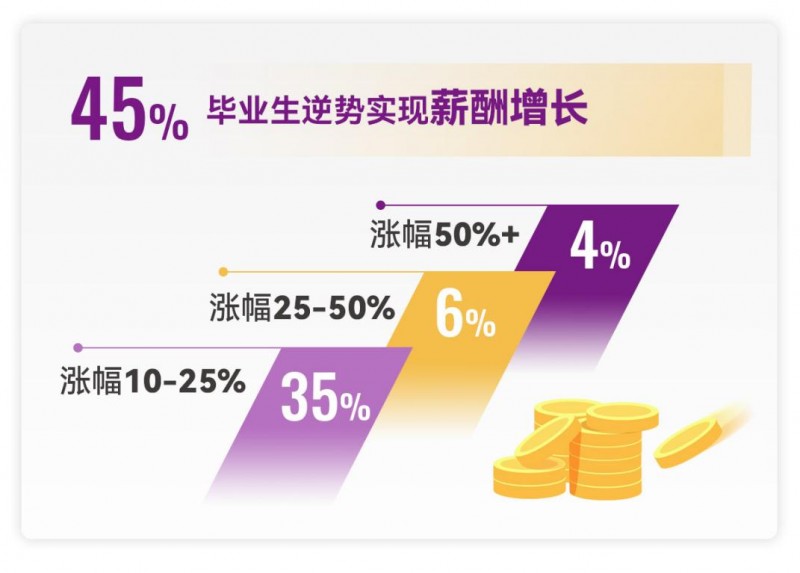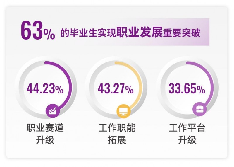 在经济波动与疫情挑战的环境之下,MBM2024届毕业生展现出了惊人的适应力与职业发展活力。他们在职场征途上稳健前行,个人成长的轨迹同样耀眼夺目。超过80%毕业生在职业道路上实现了显著的进展与转型,涵盖职位层级的跃升、所在平台的更迭、职责范围的拓宽以及团队管理的扩张。尤为值得一提的是,有63%的毕业生在职业生涯中迎来了关键性的飞跃,而45%的毕业生则迎来了薪资水平的提升,彰显出他们过去两年中的奋斗与成长。