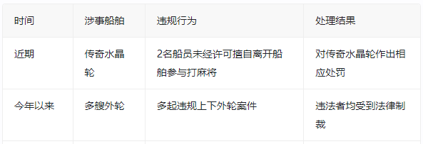 在广州边检总站东莞边检站的严格监管下,近期发现并处理了一起船员未经许可擅自离开入境船舶参与打麻将的违规事件。此事件涉及“传奇水晶”号和“皇冠钻石”号两艘船舶,相关船员未经边防检查许可,擅自离开“传奇水晶”号前往“皇冠钻石”号参与娱乐活动。东莞边检站依据《中华人民共和国出境入境管理法》第八十三条第一款第三项,对“传奇水晶”号作出了相应处罚。