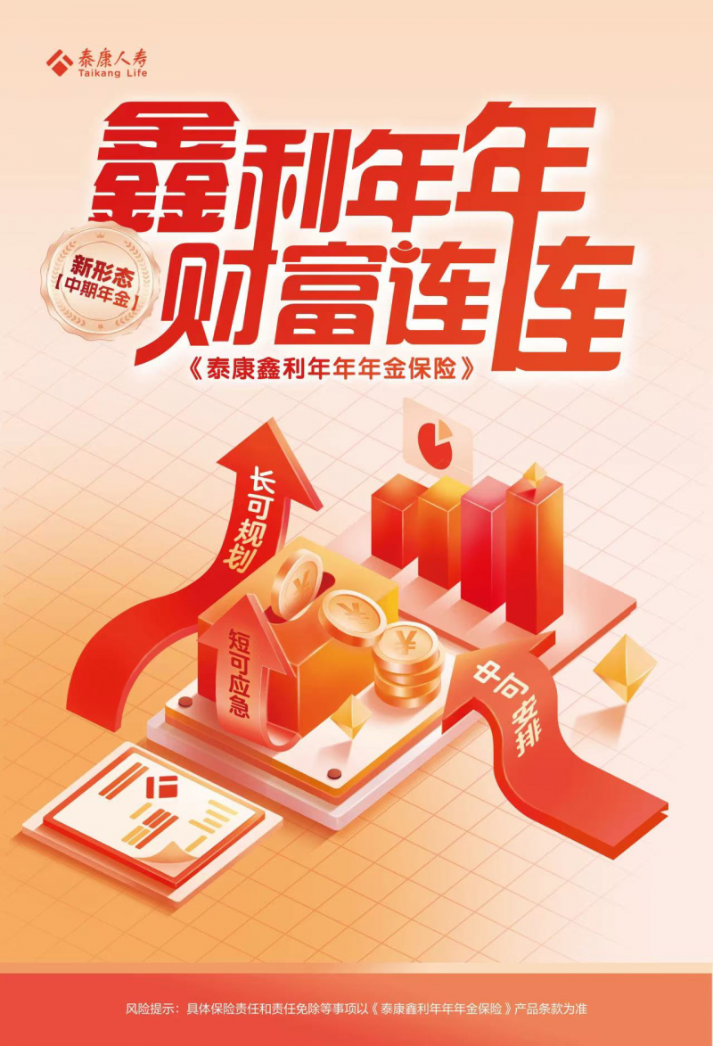 在低利率与不确定性的时代,泰康鑫利年年年金计划以“短期投入+中期规划”满足客户灵活支配和复合增值双重需求,为家庭财富筑起“短期播种—中长期收获—泰康全面守护”的人生规划。让保险保障成为每个客户、每个家庭抵御风险的底气,利用好保险年金让关键人生阶段尽在掌握。