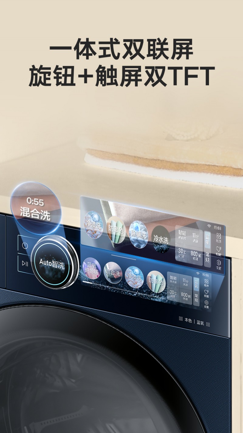 面对AI浪潮带来的人机交互更智慧、更便捷,小天鹅本色99系列洗烘套装也创造性地使用“一体式双联屏”设计,双TFT屏的灵动交互,带来视觉和感官的全新体验,让旋钮、触屏都好用。