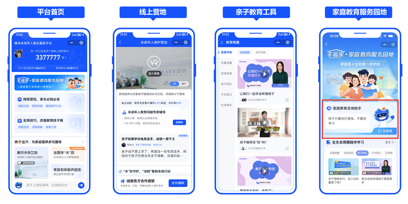 为帮助家长深度理解孩子网络行为背后的心理需求,在亲子间搭建起情感共鸣与相互理解的桥梁,腾讯客服未保营地组建教育辅导专家团队、推出家庭教育AI大模型,为家长提供心理支持和教育指导,帮其更深入地理解孩子的心理需求与网络行为。