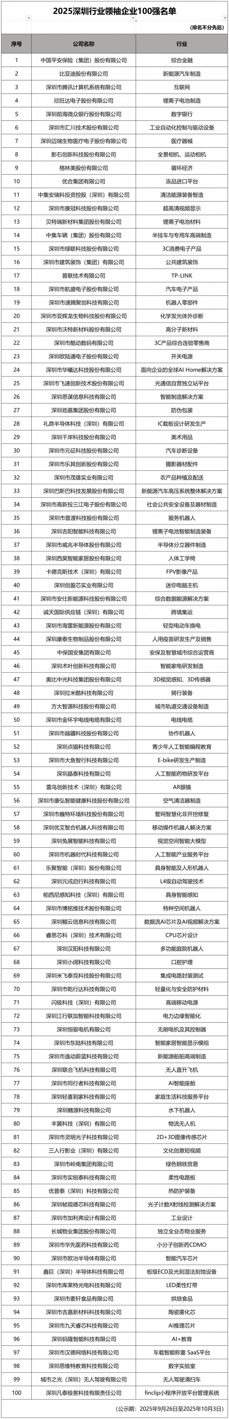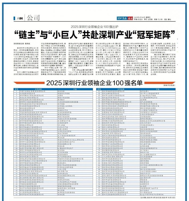 此次“2025深圳行业领袖企业100强”评选,通过集中展示深圳各个细分行业有影响力、有示范性的标杆企业,进一步推动深圳建设具有自身特点和优势的现代化产业体系,促进科技创新和产业创新的融合发展。