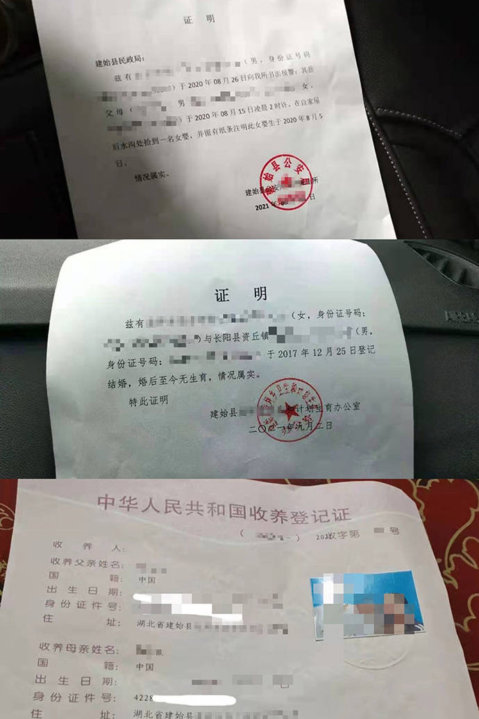 9月中下旬,根据打拐志愿者上官正义提供的线索,澎湃新闻记者(www.thepaper.cn)前往湖北省建始县和江苏省常熟市,以咨询落户的领养人身份,暗访两户涉嫌以“捡拾弃婴”的方式报假警,为违法收养的孩子办理落户的家庭——前者已顺利落户,后者已向所在辖区派出所报案,等待出具“捡拾弃婴报案证明”,以完成整个上户过程中至关重要的一环。