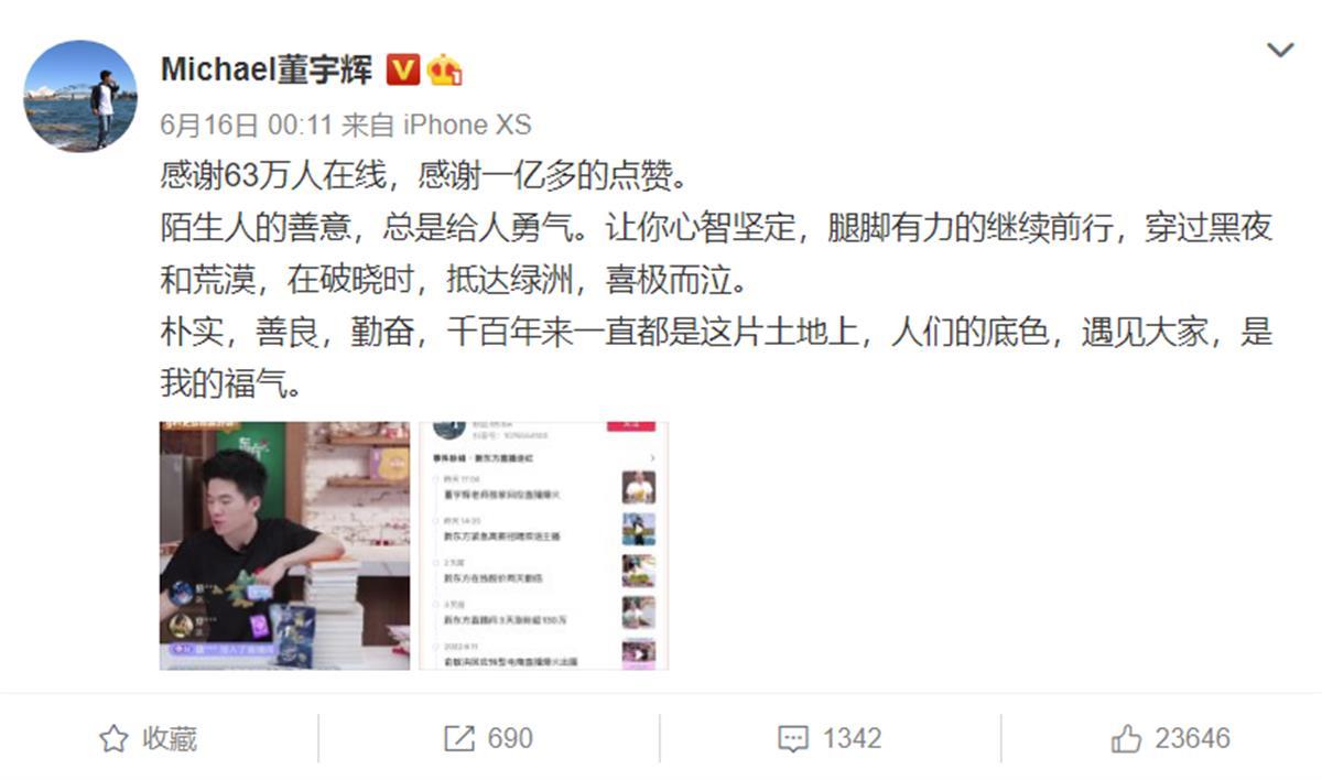 6月16日,新东方创始人、董事长俞敏洪于微信公众号发表《也无风雨也无晴》,回顾了东方甄选的发展历程。他表示,从去年年底决定做东方甄选,决定以农产品为主要带货品,一直就受到了社会各界的各种质疑。过去的半年,虽然数据有增长,但是不温不火,他也一直告诉团队不要急。6月10日,董宇辉视频受到了网友的强烈关注,形成了病毒式的传播:10日早上短视频发出去,到晚上,同期进入东方甄选直播间的网友就已经到了两三万人,到董宇辉直播的时候,就到了五万人左右。6月15日晚,董宇辉的直播,达到了同期在线六十万人以上。