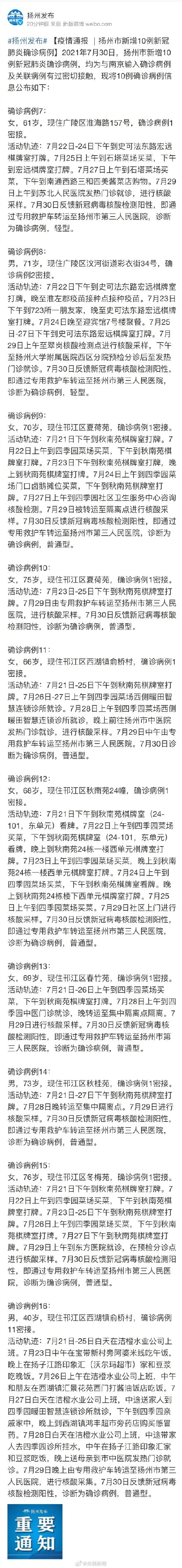 【扬州多例新增确诊曾在棋牌室打牌】@扬州发布 :7月30日,江苏省扬州市新增10例新冠肺炎确诊病例,均为与南京输入确诊病例及关联病例有过密切接触。此前,扬州在此轮疫情中已报告6例本土确诊病例。30日,扬州10例新增本土确诊病例详情如下