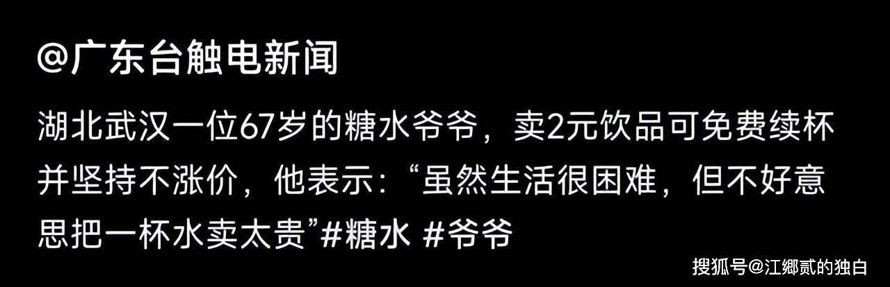 火了难道就要遭殃吗?不是因为恶搞而火,也不是因为炒作而火,而是凭借几十年不涨价的真诚善良而火,糖水爷爷这样努力又勇敢生活的人,不应该被苛责。反而试问那些指手画脚的键盘侠们,他们是否能够做到像这位老人一样,住在又破又旧的房子里,还能坚持用2元一杯的糖水谋生?显然不能,他们只会在自己的认知范围和道德标准下去评判别人。